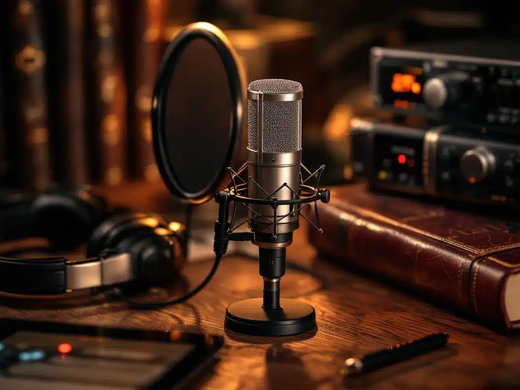 Voor een kwalitatief audioboek heb je minimaal een condensator microfoon, gesloten koptelefoon, audio-interface en een computer met opnamesoftware nodig. Een stille ruimte met akoestische behandeling voorkomt echo en achtergrondgeluid.