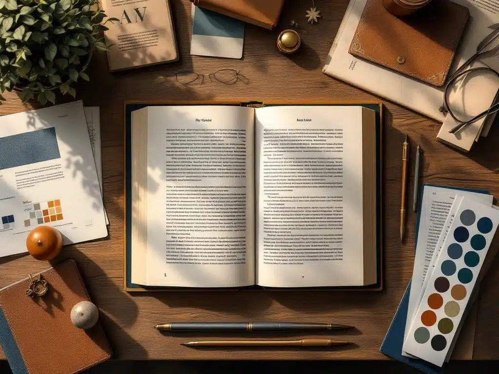 Boekontwerp bestaat uit meerdere samenhangende elementen die samen de visuele identiteit van je boek bepalen. De belangrijkste onderdelen zijn de omslagontwerp met titel, beeldkeuze en kleurgebruik, de typografie voor leesbaarheid, de layout met witruimte voor een prettige leeservaring, en technische specificaties die verschillen tussen digitale en gedrukte versies. Deze elementen werken samen om je verhaal visueel te ondersteunen en lezers aan te trekken.