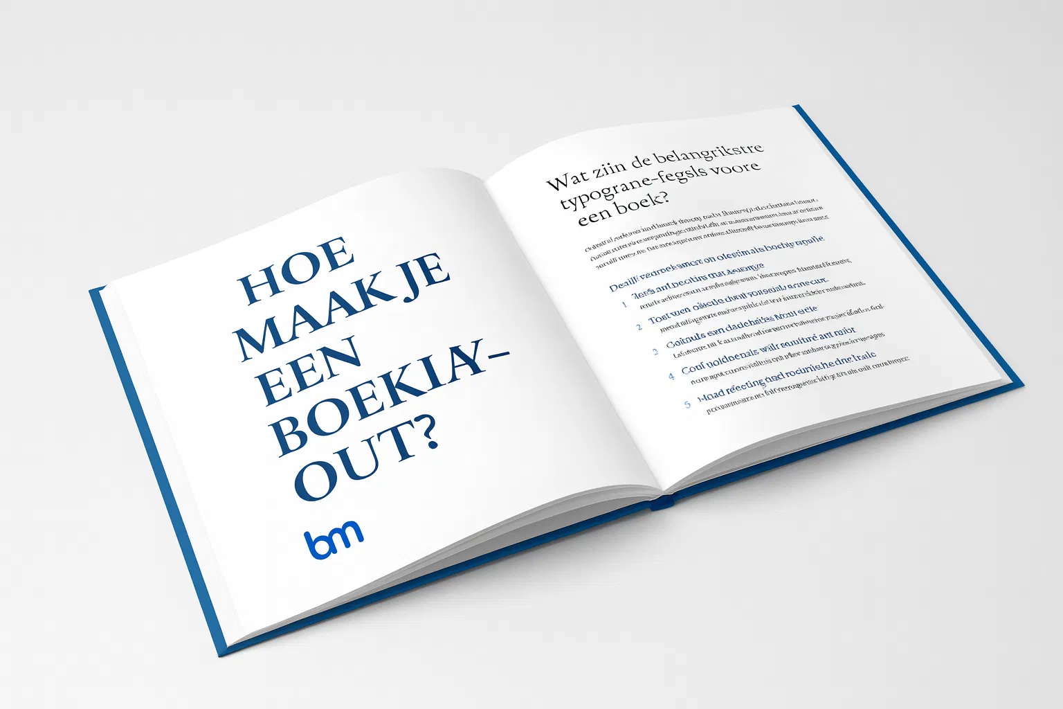 Open liggend boek met de titel “Hoe maak je een boeklay-out?” en het blauwe bm-logo, weergegeven in een strakke professionele stijl die boekopmaak en typografie illustreert.Door de juiste lettertypen, marges, witruimte en regelafstand te gebruiken, krijgt je boek een uitgeverswaardige uitstraling. Voor vrijwel elk genre — van roman tot biografie — bestaan vaste typografie-regels die zorgen voor rust, consistentie en optimale leesbaarheid. Zo voorkom je fouten bij het drukken en creëer je een boek dat lezers direct serieus nemen.